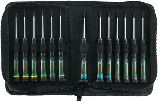 Precíz és kontrollált finomcsavarozásra tervezett csavarhúzók mindig kéznél A Bosch kiváló minőségű precíziós csavarhúzó készletével gyorsan és hatékonyan javíthatod a kis elektronikai eszközöket, szemüvegeket, laptopokat vagy órákat. A készlet 13 precíziós csavarhúzót tartalmaz (SL1.5, SL2.0, SL2.5, SL3.0, PH000, PH00, PH0, TX5, TX6, TX8, TX9, HEX1.5, HEX2.0), amelyeket a csúcsteljesítmény és a maximális kényelem érdekében terveztek: mindegyik a legjobb minőségű, rendkívül kemény S2 acélból készül, amely legalább 40%-kal nagyobb nyomatékot biztosít, mint az ISO szabvány. Karcsú, ergonomikus kialakításuk puha markolattal és forgó sapkával a jobb kezelhetőség és kényelem érdekében lehetővé teszi az egyszerű és gyors forgatást, miközben optimális erőt biztosít a kontrollált, precíz csavarozáshoz. A csavarhúzó hegye mágneses a stabil munkavégzés érdekében, a fekete foszfát bevonat pedig jobb vizuális kontrasztot nyújt. A markolat hatszögletű vége megakadályozza, hogy a csavarhúzó leguruljon az asztalról. Melyik csavarhúzó felel meg az adott feladathoz? A válasz egyszerű – a markolaton és a szerszám hátsó részén található színkódolásnak köszönhetően a választás gyorsabb. Az összes csavarhúzó kényelmesen elhelyezhető a praktikus cipzáras textiltokban.