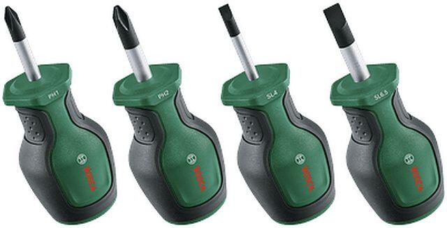 Kompakt kialakítás erős szárral a kényelmes és pontos csavarozáshoz szűk helyeken A Bosch rövid csavarhúzó készlete kényelmes és praktikus megoldást nyújt gyors és hatékony bútorszereléshez, javításokhoz és sok más barkácsfeladathoz szűk helyeken. 4 rövid csavarhúzót tartalmaz (PH1, PH2, SL4, SL6.5). Az ergonomikusan tervezett kétkomponensű markolat puha fogófelületekkel és a kompakt, 29 mm-es szárral optimális kényelmet és irányítást biztosít még nehezen hozzáférhető helyeken is. Minden rövid csavarhúzó rendkívül kemény S2 acélból készül, és lenyűgözően nagy nyomatékot biztosít, amely legalább 40%-kal meghaladja az ISO szabványt (a szabványok szerint: ISO 2380, ISO 8764). A fekete foszfát bevonatú mágneses hegy jobb vizuális kontrasztot és csavarozási teljesítményt nyújt. A csavarhúzó markolatának hatszögletű eleje megakadályozza az elgurulást. Melyik csavarhúzó felel meg az adott feladathoz? A válasz egyszerű – a markolaton található színkódolásnak köszönhetően a méretek és formák gyorsan azonosíthatók.