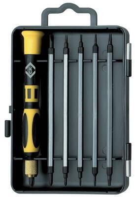 Precíziós csavarhúzó készlet Multi-Blade 7 részes 6 kettős pengévelErgonomikusan kialakított nyél, homorú forgató kupakkal a könnyű és precíz használathoz. Kicserélhetők a két végén lévő, jó minőségű króm vanádium molibdén acélból készült a nagy szilárdság és tartósság végett precízen megmunkált és a csavarokba pontosan illeszkedő pengehegyek. Műszaki adatok: Alkalmazás: Elektronika- és finommechanika · Anyag: Króm-vanádium-molibdén acél · Csavarhúzó típus: Cserélhető penge készlet · Elhajtás: Egyeneshornyú, Kereszthornyú Phillips, TORXSzállítás tartalma: Csavarhúzó szár. Két végű szárak, méretek: egyenes pengéjű 1,5 mm PH000-val, egyenes pengéjű 2,0 mm PH00-val, egyenes pengéjű 3,0 PH0-val, egyenes pengéjű 4,0 mm PH1-el, TX05 a TX06-al és a TX07 a TX08-al.