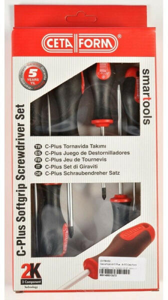 CETA FORM 6 részes csavarhúzó készlet: Precíz és tartós szerszámok ? Ez a CETA FORM csavarhúzó készlet ideális választás otthoni és professzionális felhasználásra egyaránt. A készlet króm-molibdén-vanádium acélból készült, ami garantálja a hosszú élettartamot és a megbízhatóságot. A készlet tartalma:Lapos csavarhúzók: 3x75 mm 4x100 mm 5,5x125 mm 6,5x150 mmPhillips (PZ) csavarhúzók: PZ1x80 mm PZ2x100 mmFőbb jellemzők: ? Króm-molibdén-vanádium acél: A tartósság és a hosszú élettartam érdekében. ? Magnetizált hegyek: A csavarok könnyű és pontos rögzítéséhez. ?️ Kétkomponensű nyél: Kényelmes és biztonságos fogást biztosít. ?️ Akasztólyuk a nyél végén: A könnyű tárolásért.