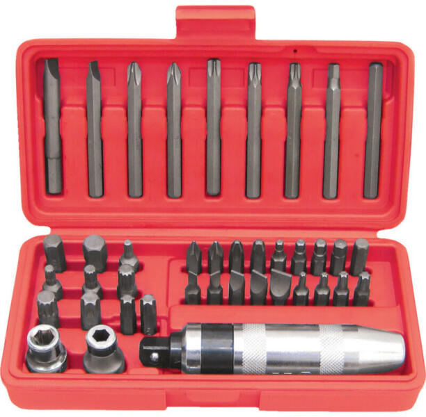 Ipari minőségű ütvecsavarhúzó irányváltós csavarozó mechanizmussal. Amikor az ütésálló nyelet kalapáccsal megütjük, a lefelé ható erőt a csavarhúzó belső mechanizmusa erős forgónyomatékká alakítja át. Ideális rögzítőelemek végleges meghúzásához illetve beragadt rögzítőelemek meglazításához. A hatszög meghajtójú orr-rész eltávolítható, így a 1/2" négyszög meghajtó közvetlenül használható erősített dugókulcsokkal. Szerelő csavarhúzó bit készlet 1/2"? négyszög x 5/16"? hatszög bit adapter; 1/2"? négyszög x 3/8"? hatszög bit adapter. 80mm x 3/8"? hatszög bitek: Hatszög: 8mm, 6mm, TX: Tx40, Tx45, Tx50, Kereszthornyos: No. 2, No. 3, Hornyos: 8mm és 10mm; 35mm x 3/8"? hatszög bitek: Hatszög: 4mm, 5mm, 6mm, 7mm, 8mm, TX: Tx20, Tx25, Tx30, Tx40, Tx45, Tx50, Kereszthornyos: No 1, 2, 3 és 4, Hornyos: 5mm, 6mm, 8mm, 10mm, 12mm; 30mm x 5/16"? hatszög bitek; Hatszög: 10mm, 12mm, TX: Tx55, XZN: 5mm, 6mm, 8mm, 10mm, és 12mm.