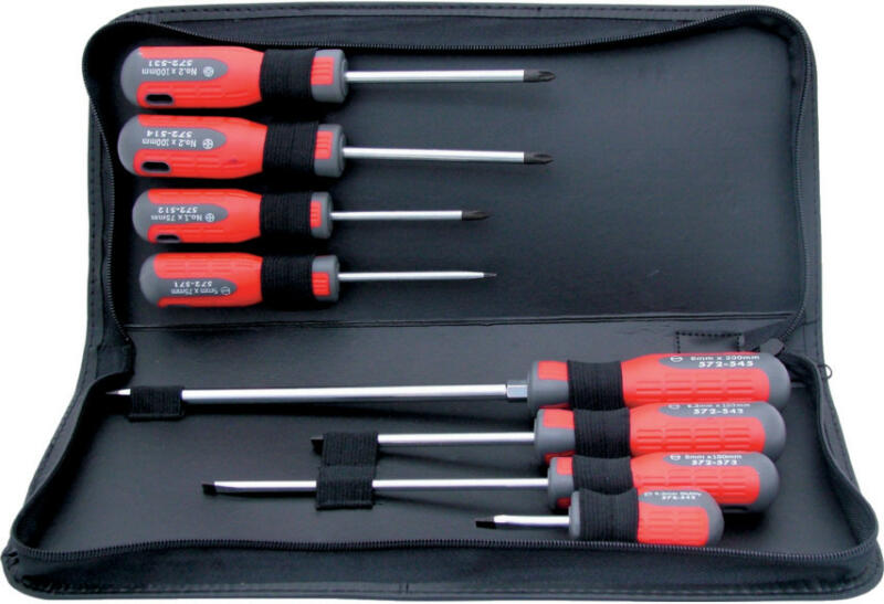 8 darabos készlet összetétele: Kereszthornyos: No. 1 x 75, No. 2 x 100. Pozidriv: No. 2 x 100. Kúpos élű: 6.3 marok, 6.3 x 100, 8.0 x 200. Párhuzamos élű: 5.0 x 75, 5.0 x 150.