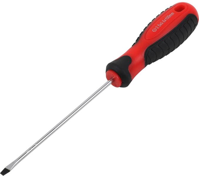 A 3,5 mm x 100 mm-es csavarhúzó hornyos csavarok megbízható meghúzását és kioldását szolgálja. Pengéje nikkelezett króm-vanádium acélból, míg a kétkomponensű markolat műanyagból készült. A penge hegye extra krómozást kapott. A szerszám 3,5 mm átmérőjű hornyos csavarokhoz alkalmas.