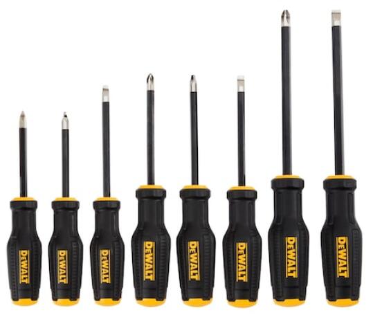 DWHT65102-0 *DEWALT Csavarhúzó készlet, ToughSeries, 8 db-os *Kialakítás: nagy teherbírású, ütésálló markolat *Penge anyaga: nagy szilárdságú acél *Markolat: ergonomikus, háromkomponensű *Speciális jellemzők: fém sapka a kalapácsütések elviseléséhez *Készlet tartalma: különböző méretű laposfejű és csillagfejű csavarhúzók *Alkalmazás: bontási és nehéz szerelési munkákhoz *Tárolás: műanyag tároló táska