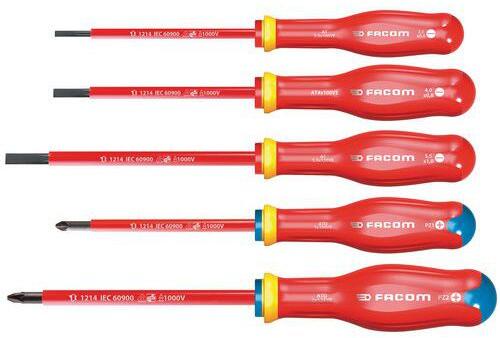Szigetelt villanyszerelő csavarhúzókészlet 1000 V-ig terjedő feszültség alatti munkákhoz. Minden csavarhúzót 10 000 V-on tesztelnek 10 másodpercig. Tokban szállítjuk.