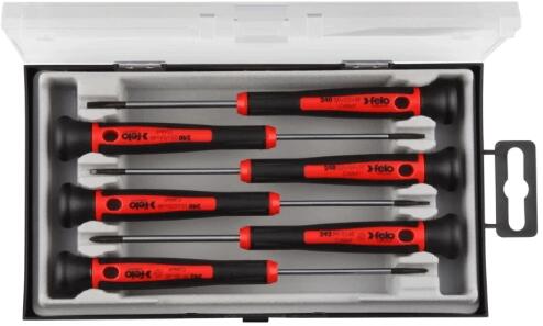 FELO műszerész csavarhúzó készlet, kétkomponensű csúszásmentes markolattal. A markolat végén elhelyezkedő szabadon forgó sapkának köszönhetően a súrlódás minimálisra csökken. A markolatban található furat segítségével könnyen tárolható a szerszám és egy másik FELO csavarhúzó segítségével extra nyomaték érhető el. Tartalma: 1,5x60, 2,0x60, 2,5x60, 3,0x60, PH00x60, Ph0x60. Penge Anyaga: króm-molibdén-vanádium acél ötvözet. Felületkezelés: krómozott, a hegy bevonat nélküli a pontos méret és illeszkedés érdekében