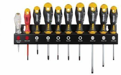 FELO Ergonic csavarhúzó készlet, műhelyben alkalmazható fém faliartóval. Tartalma: 3 db lapos, 2 db PZ, 3 db Torx, 1 db lapos szigetelt, 1 db fázisceruza csavarhúzó