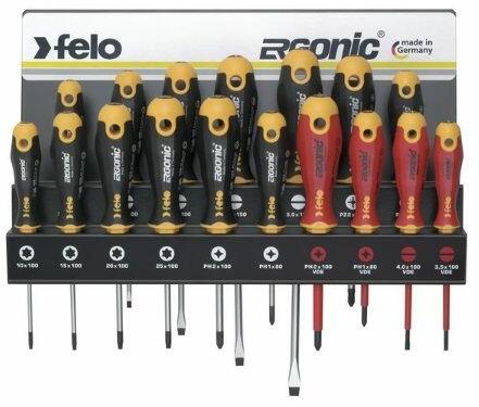 FELO Ergonic csavarhúzó készlet, műhelyben alkalmazható fém faliartóval. Tartalma: 5 db lapos, 2db PZ, 2 db PH, 4 db Torx, 2 db lapos szigetelt és 2 db PH szigetelt csavarhúzó