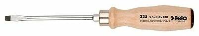 FELO lapos csavarhúzó hornyos csavarokhoz, hengeres keresztmetszetű pengével, fa markolattal. A szerszámban végigfutó acél penge lehetővé teszi a penge közvetlen ütését. A pengén lévő erősített hatszög részen villáskulcs segítségével növelhető a nyomaték. Méretei: hegy szélessége: 5,5 mm, hegy vastagsága: 1,0 mm, penge hossza: 100 mm. Penge Anyaga: króm-molibdén-vanádium acél ötvözet. Felületkezelés: krómozott, a hegy bevonat nélküli a pontos méret és illeszkedés érdekében