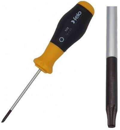 FELO Torx csavarhúzó, különösen nagy igénybevételre tervezett, kétkomponensű markolattal. Méretei: T15, penge hossza: 100 mm, penge átmérője: 4,0 mm, markolat hossza: 90 mm, markolat legnagyobb átmérője: 29 mm. Penge Anyaga: króm-molibdén-vanádium acél ötvözet. Felületkezelés: krómozott, a hegy bevonat nélküli a pontos méret és illeszkedés érdekében.