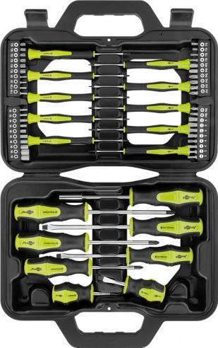 Precíziós csavarhúzó króm-vanádium acélból (CRV), amely fokozottan ellenáll a deformációnak. Mágneses hegyek a biztonságos nyomatékátvitelhez és a gyors rögzítéshez. Ergonomikus markolatok a kényelmes, szilárd fogásért munka közben. Csúszásmentesség a gumírozott szárnak köszönhetően. Alkalmas minden szokásos csavarozási és szerelési munkához, valamint a finommechanikai munkákhoz. 17 db csavarhúzó:3x hornyos csavarhúzó: 6x125mm, 5x100 mm, 6x38 mm3x Phillips csavarhúzó: PH2x125 mm, PH2x100 mm, PH1x75 mm, PH2x38 mm1x bit tartó2x precíziós hornyos csavarhúzó: 2,5x50 mm, 2x50 mm2x precíziós Phillips csavarhúzó: 2,5x50 mm, 2x50 mm6x precíziós Torx csavarhúzó: T5, T6, T7, T8, T9, T10x50 mm40 db bit:8x hornyos: 3 mm, 3 mm, 4 mm, 4 mm, 4 mm, 5 mm, 5 mm, 5 mm, 6 mm, 6 mm, 6 mm8x Phillips: PH0, PH0, PH1, PH1, PH2, PH2, PH3, PH3, PH310x Torx: T10, T10, T15, T15, T20, T25, T25, T30, T30, T3014x hatszögletű: H2, H2. 5, H2.5, H3, H3, H4, H4, H4, H5, H5, H6 , H6, H8, H8, H81 db Tok