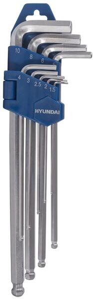 Ez a Hyundai Gömbvégű imbuszkulcs készlet könnyen csavarja le és húzza meg az imbuszcsavarokat. 9x (CrV): HEX1.5, HEX2, HEX2.5, HEX3, HEX4, HEX5, HEX6, HEX8, HEX10.