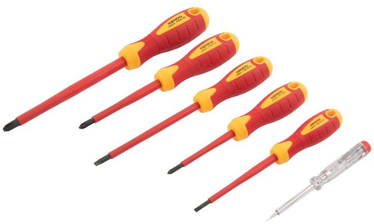 Kendo 5+1 db-os szigetelt VDE csavarhúzó készlet, 1000V feszültségig használható. A csavarhúzók az IEC60900 szabvány szerint VDE tanúsítottak. Edzett króm-vanádium acélból készült. Mágnesezett csavarozóhegy. Két komponensű ergo markolattal rendelkezik
