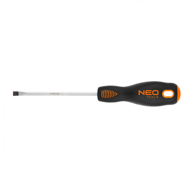 NEO lapos csavarhúzó. A csavarhúzó szára kivételesen ellenálló S2. A csavarhúzó hegy hőkezelésnek lett alávetve, így megfelelő, 56 HRC keménységet és hajlítószilárdságot ért el. A csavarhúzó hegye mágneses. A markolat három élű hasáb alakja a kialakított hüvelyktámasszal csökkenti a kéz megterhelését munka közben, és megkönnyíti a megfelelő forgatónyomaték elérését. A bimateriál markolat nem csúszik ki a kézből, ellenálló vegyszerek, kenőolajok és zsírok hatásának. A szerszám minőségét bizonyítja a TÜV tanúsítvány és a gyártó által nyújtott 25 éves jótállás. A NEO márka a professzionális igényeket is kielégíti.