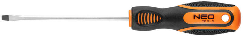 NEO lapos csavarhúzó kiválóan alkalmas szerelési, barkácsolási munkákra. Hegye nagy ellenállóképességű, a szerszámnak hosszú élettartamot biztosító króm-vanádium acélból készült. A mágneses hegy megkönnyíti a szerszámmal végzett munkát Az ergonómikus, csúszásmentes anyaggal bevont műanyag markolat biztosítja a kényelmet és a biztonságot a munkavégzés során. A NEO márka a professzionális igényeket is kielégíti. Lapos csavarhúzó, edzett, mágneses hegy, CrV acél, bimateriál markolat