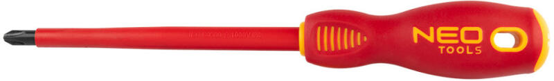 A NEO 1000 V-ig szigetelt csavarhúzó, PH3 x 150 mm, cikkszám: 04-075 egy szigetelt, villanyszerelők által használt szerszám. Legfeljebb 1000 V-os feszültséggel való munkavégzéshez használható, tartós S2 acélból készült. A csavarhúzó háromszög alakú markolattal és kontúros hüvelykujjtámasszal rendelkezik. A NEO márkájú termékek már több szezonon keresztül bizonyítottak.