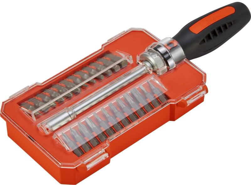 Ez az OBI bit-csavarhúzó magán és professzionális mesterembereknek egyaránt alkalmas. A 24 részes bittartó tárral felszerelt készlet optimális mobil használatra, és a különböző munkákhoz mindössze egy csavarhúzó használható. A bitkészlet 4x hornyolt, 4x kereszt-, 4x kereszt-/csillag-, 6x torx- és 6x külső hatlapú csavarhúzóból áll. A csavarhúzó nyele műanyagból készült, és puha tapintású bevonattal rendelkezik, amely matt és elegáns narancs-fekete megjelenést kölcsönöz neki. A króm-vanádium acélból készült, kivehető, 115 mm hosszú nyél erőteljes és precíz munkavégzést tesz lehetővé a szűk és nehezen hozzáférhető helyeken is. A készlet egy praktikus bit-rendszerezőben kerül kiszállításra, amelyben átláthatóan tárolhatja az összes tartozékot.