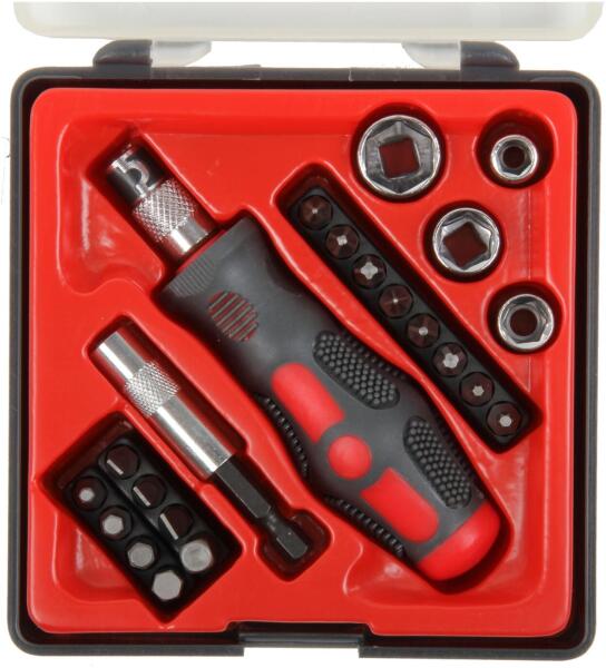 10022 Csavarhúzó CrV bitekkel és foglalatokkal, 22 részes készlet, Proline . Mágneses hegyű markolat . Foglalattartó a dugókulcsokhoz (dugókulcskulcsok) . 4 db 1/4"-os dugókulcs: 6, 8, 10, 13 mm . 15 bit: PZ1, PZ2, PZ3, PH1, PH2, PH3, T10, T15; lapos: 4, 5, 6 mm; hatszögletű: 3, 4, 5, 6 mm Hexagonális adapter Tartalmazott mennyiség_ 22 db .