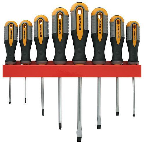 Csavarhúzó készlet professzionális fogantyúval. Készlet tartalma: Lapos csavarhúzó: 3 x 75, 4 x 100, 5 x 100, 6 x 125, 8 x 150 Phillips csavarhúzó: 0 x 75, 1 x 100, 2 x 125