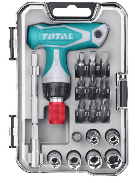A TOTAL TACSD30186 többcélú csavarhúzókészlet egy univerzális kézi eszköz 24 az 1-ben kivitelben, alkalmas különböző típusú önfékező illesztékek felszerelésére és leszerelésére: SL, PZ, PH, T és H.