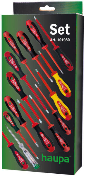 Haupa VDE Plus 15 részes csavarhúzó készlet - A biztonságos és precíz munkavégzéshez! ? Ez a 15 darabos VDE csavarhúzó készlet ideális választás minden szakember számára, aki elektromos munkát végez. A készlet tartalmazza a leggyakrabban használt csavarhúzó típusokat és méreteket, így szinte minden feladathoz megtalálható a megfelelő eszköz. Főbb jellemzők:Kétkomponensű markolat: Ergonomikus kialakítás a kényelmes és biztonságos fogásért. ? Molibdén-vanádium acél penge: Rendkívül tartós és kopásálló. ? Indukciósan edzett: A penge még nagyobb szilárdságú és élettartamú. ? Egyedileg tesztelt szigetelés: Garantált biztonság 1000 V-ig. ⚡ Feszültségmérő: 100-250 V közötti feszültség ellenőrzésére. ? A készlet tartalma:VDE hornyos csavarhúzók: 2,5 x 0,4 x 75 mm, 3 x 0,5 x 100 mm, 4 x 0,8 x 100 mm, 5,5 x 1,0 x 125 mm VDE Phillips csavarhúzók: 1-es és 2-es méret VDE Pozidriv csavarhúzók: 1-es és 2-es méret VDE Torx csavarhúzók: T10, T15, T20, T25 Feszültségmérő: 100 – 250 V Ez a készlet nélkülözhetetlen minden villanyszerelő, karbantartó és barkácsoló számára, aki a biztonságot és a minőséget helyezi előtérbe. ?