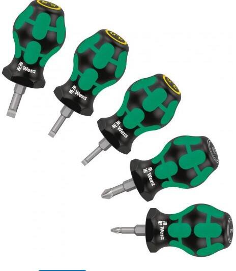 Praktikus csavarhúzó készlet rövid nyéllel, hatszög kulcsrásegítéssel, nehezen hozzáférhető helyekhez. Előnyök/Kivitel hatszögletű, gurulásgátló nyél Take it easy szerszámazonosítás – profil szerinti színkódolás, méretjelöléssel Anyag magas ötvözetű speciális acél, matt krómozott kétkomponensű nyél Szállítás terjedelme lapos 0,6 x 3,5 / 0,8 x 4,0 / 1,0 x 5,5 x 24,5 mm kereszthornyos PZ 1 / PZ 2