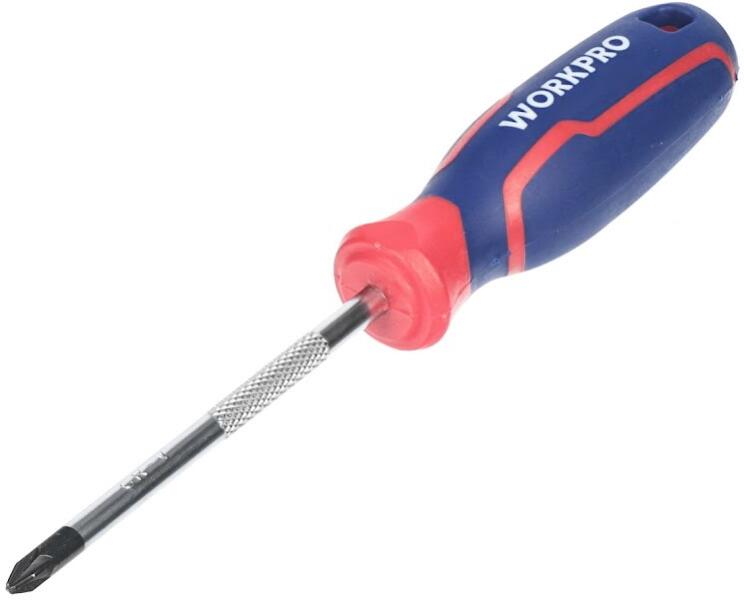 A WORKPRO kereszthornyos csavarhúzóval bármikor rögzítheti és eltávolíthatja a kereszthornyos csavarokat. Ez a csavarhúzó erős gumimarkolattal rendelkezik, így lehetővé teszi a precíz munkavégzést. Szárának hossza 101 mm, hegyének mérete PZ2.