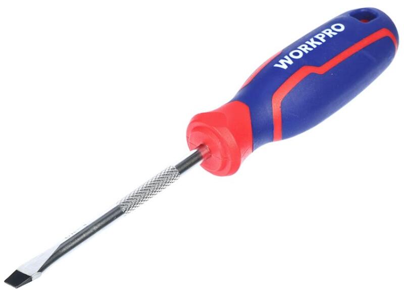 A WORKPRO lapos csavarhúzó hasznos segítőtárs az egyhornyú csavarok meghúzásához és lazításához. A biztos és csúszásmentes fogásnak köszönhetően precizitással és kényelemmel dolgozhat vele. Ez a csavarhúzó 101 mm-es szárhosszal rendelkezik, ami biztosítja a jó hozzáférést.